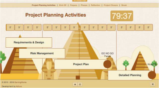 通过高互动性的情景模拟, 项目管理最佳实践的最重要方面将被生动地展现出来。金字塔的搭建工作情景将使游戏参与者体验良好的项目管理中的可控环节。在金字塔搭建的过程中所有的参与者都将在项目管理的环境中扮演一个角色。