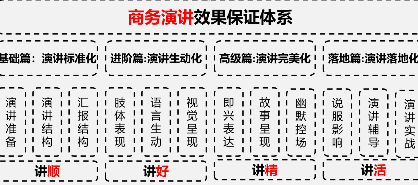 课程对象:企业中高层领导、一线工作人员、业务骨干、营销人员、面临对外融资、工作汇报、竞聘竞职、产品宣讲、对外投标、会议发言等场景的人员