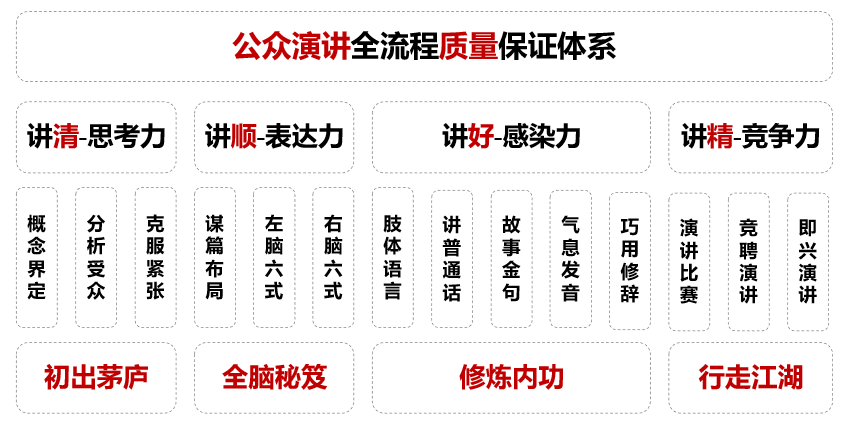 解决敢讲,能讲,会讲的问题,提升学员的四大能力: