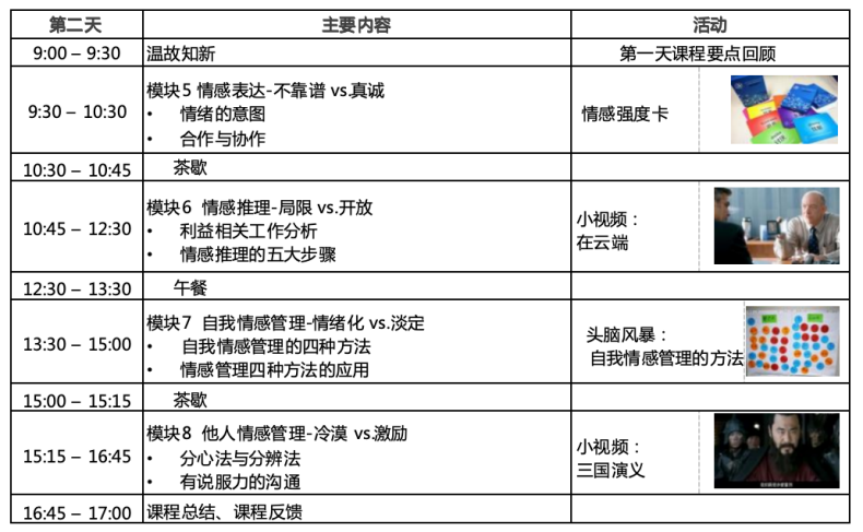 情感智能EI可以非常有效地带领我们体验与认知自己的情绪,同时觉察他人的情绪信息,有效地表达不同类型的情感,促进人与人的信任,达到上下兼容的状态。情感智能 (EI) 是自我认知、 同理心、领导力、抗压能力以及取得工作成就的基础。学员通过学习情感智能,会有更积极向上的工作状态, 有效地营造更快乐高效的工作氛围和更好地引领与激发团队。