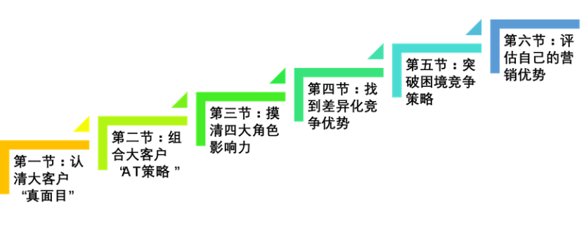 这是一门实战性非常强的大客户营销策略课程,与《信任五环——大客户超级沟通技巧》不同的是更侧重于营销策略,除了解决以上的问题,还能帮助销售人员建立系统的客户分析的流程与方法,按照客户的反馈制定相应的营销策略,帮助企业建立以客户为中心的营销模式,识别真假销售机会,制定具有竞争优势的抢单策略。