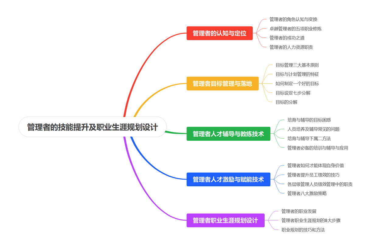 本课程从管理者的角色认知与定位入手,帮助每一位职场人、管理者更加清晰自身的角色及岗位价值,重点讲解目标的制定及落地、如何培养及辅导下属及新人、如何激励团队人员,如何结合岗位实际及企业战略做好职业规划。帮助每一位职场人士更加清晰自身价值,更好的提升自己,为企业创造价值 ,达到双赢。