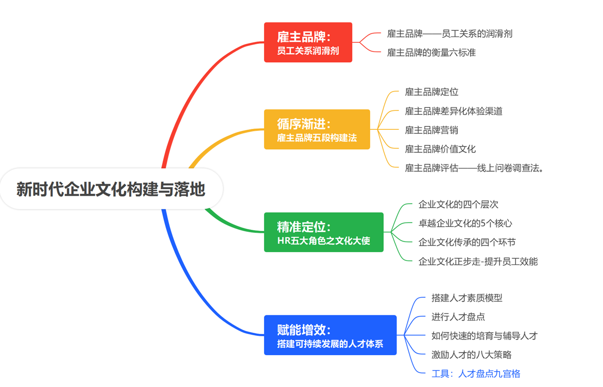 优秀的企业文化成为越来越多的企业走向成功的强大动力和重要法宝。而优秀文化是雇主品牌力彰显的内涵与本质,尤其是在当下,随着“大-云-物-区-智”的5G时代的到来,信息丰富化,新新人才更加关注企业文化,更加重视人力资源管理建设。这显得格外重要,因此,人力资源管理者不但要重新定位和认知角色,明确文化大使角色,修炼教练角色,在传承文化中推进人力资源创新,在重新中重塑企业文化品牌,本课程将从企业文化入手,重塑角色,定位职能,明确文化大使使命,完成人力资源的文化转型与创新,通过大量优秀企业案例分享、向优秀的企业学习,阐释并构建自己企业文化,让人力资源上联战略,下接文化,激活团队,赋能企业。