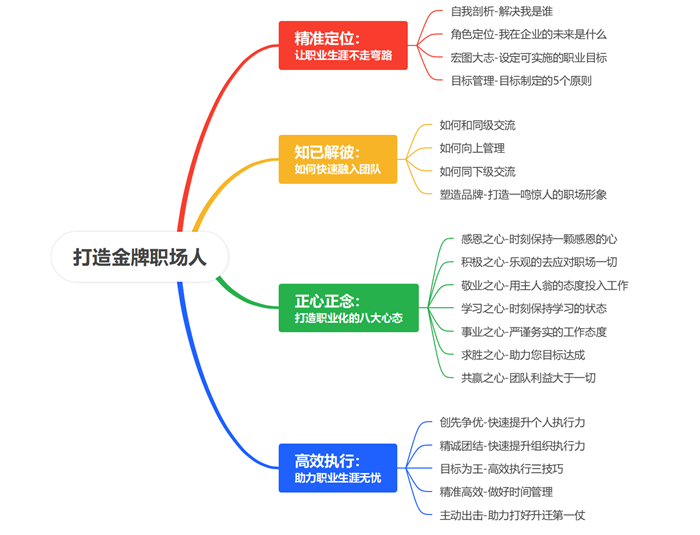 人人都渴望事业成功,这是人的本性。然而,有些人一毕业就陷入了迷茫和困惑,不知道自己未来在哪里,更不清楚该如何行动,这对个人来说,是浪费时间,对企业来说就是阻碍了发展。那究竟该如何持续保持动力、让未来的每一天都充满挑战,充满乐趣,那就得好好的重新设计一下人生目标了。通过本课程的培训将帮助职场新人找准职业定位,明确职业规划、突破内外障碍、激发内在潜能、实现自我价值。