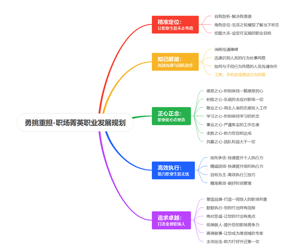 人人都渴望事业成功,这是人的本性。然而,有些人一毕业就陷入了迷茫和困惑,还有些人工作三五年后开始出现职业倦怠,不知道自己未来在哪里,更不清楚该如何行动,这对个人来说,是浪费时间,对企业来说就是阻碍了发展。那究竟该如何持续保持动力、让未来的每一天都充满挑战,充满乐趣,那就得好好的重新设计一下人生目标了。通过本课程的培训将帮助你明确职业规划、突破内外障碍、激发内心潜能、实现自我价值。