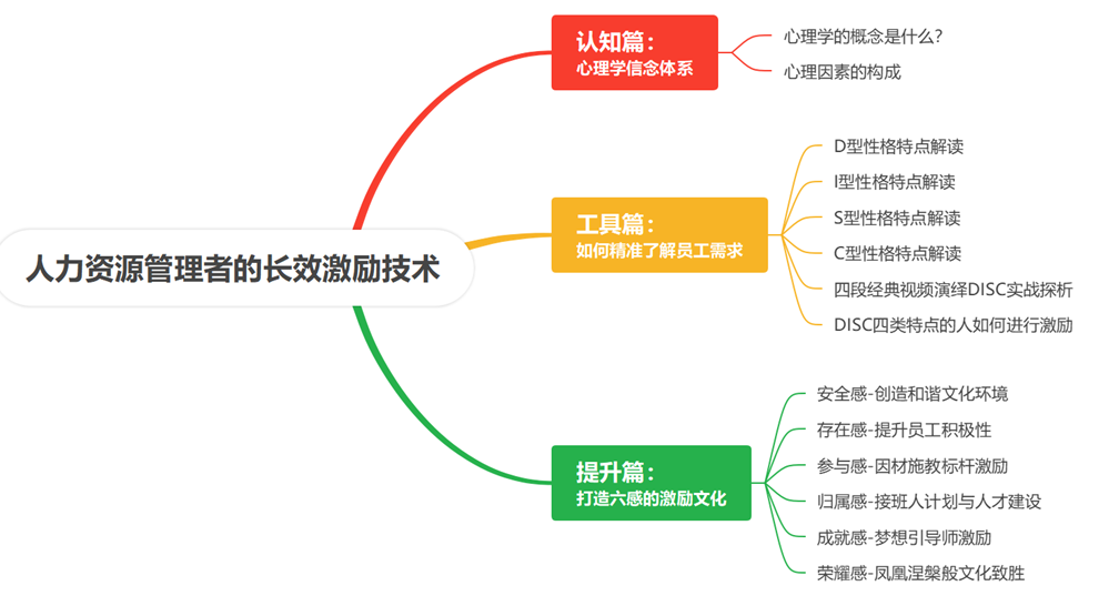 本课程通过心理学原理研究剖析,学习心理学工具-DISC,站在不同人的角度,了解每一位员工的心理需求,针对需求,设计符合不同类型人的激励方式。