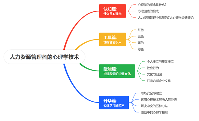本课程通过心理学原理研究剖析,对人员的赋能、激励、沟通、冲突处理、企业文化等方面进行了深入的剖析,从而帮助企业管理部门做好人才管理工作。
