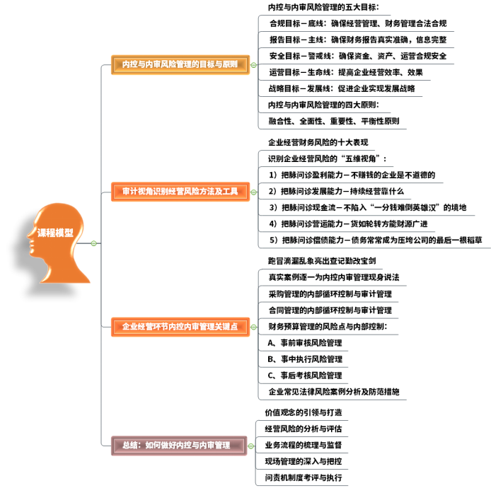 该课程旨在让参与培训人员具备经营风险意识,加强与提升内部管理能力,强化现金流管理,提高资金运作效率,降低成本增强效益,从内控与内审角度出发,综合运用风险识别的管理工具,理解隐藏在数据背后的企业经营信息,做好风险分析与评估,采取相应内部控制措施。