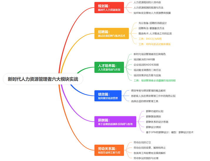 为了应对新的人才竞争,必须把实施人才战略作为企业发展第一战略,优化人力资源管理,加大人力资源开发力度,建立健全符合企业人才流动机制、目标明确及综合激励的人才培养机制、公平竞争及优胜劣汰的人才使用机制、绩效为王及体现价值的人才分配机制,本课程从企业人力资管理体系建设出发,重点研究人才战略规划的痛点,运用人才甄选工具、人才培养体系搭建、绩效与目标管理、薪酬体系搭建、劳动用工风险管控等解决企业人力资源全盘管理的具体事务。帮助企业人力资源管理者及部门管理者提升人力资源管理技能,让人力资源管理者成为更专业、更接地气的管理全才。