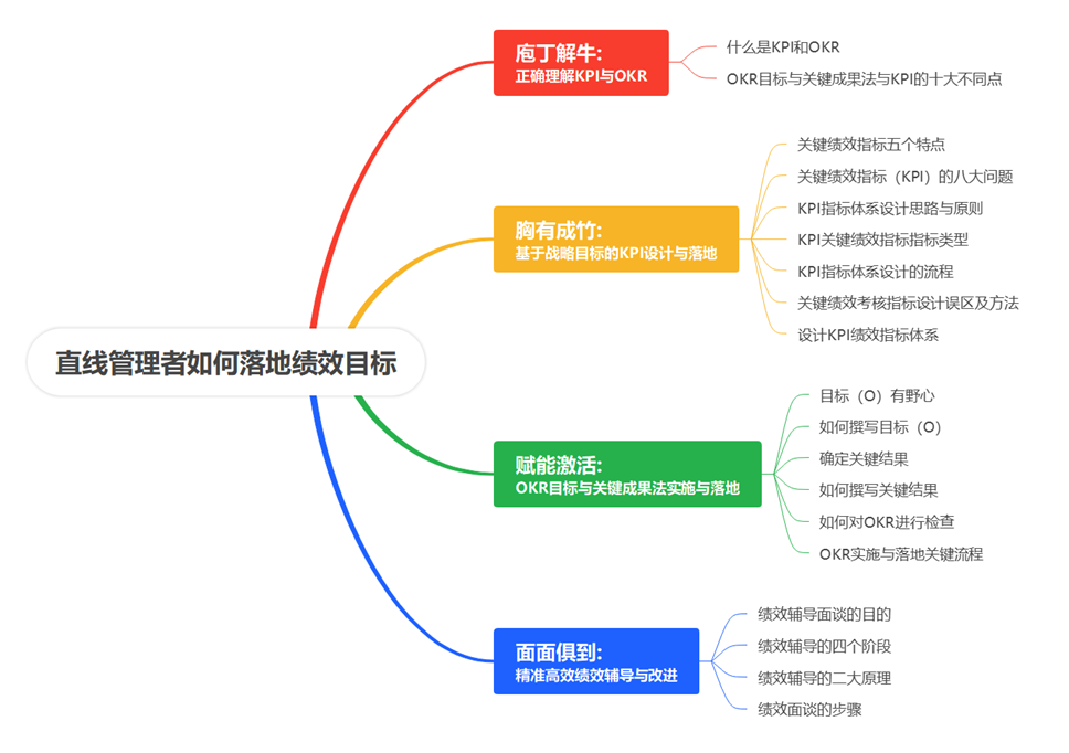 本课程从OKR与KPI的认识入手,全方位的分析、KPI与OKR的基本思想、关键点、基本原则、操作方式,结合企业实际情况,给出落地的工具及方法,通过案例分享、现场实操等帮助学员高效掌握这一管理方法,提升个人绩效水平及组织绩效水平,达成企业目标。