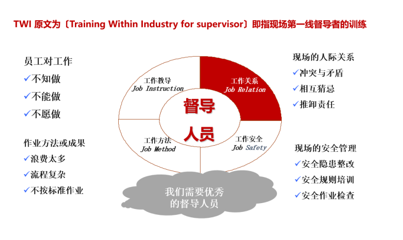 二战期间,由于美国工厂内许多熟练的技工和基层主管去服兵役,在工厂内充斥着许多技术不熟练的工人,如何在这种情况下保持工厂的效率和品质,成为企业界相当困扰的事情。最后,美国专家研究出一套快速且有效的训练方式来培养基层的工作人员,结果非常成功,这套系统便是“现场第一线督导者的训练TWI”。由于这套系统非常有效,训练成绩极佳,战后速得以传开,成为提高现场管理者业务水平的权威课程。特别是在日本,这个课程生根之后,得到了长足的发展和完善,日本劳动省明文规定,将它作为现场管理者必修的课程,同时作为制造型企业领导人员最普及的一种职业教育课程。