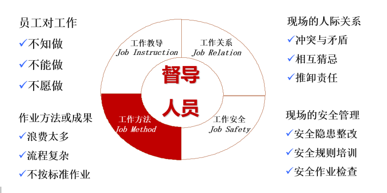 TWI共分为四个单元:JI(Job Instruction)工作教导、JM(Job Method)工作方法、JR (Job Relation)工作关系、JS(Job Safety)工作安全,TWI四个单元有机系统地联系在一起,是世界各国工厂训练班组管理人员最优秀的王牌培训课程。