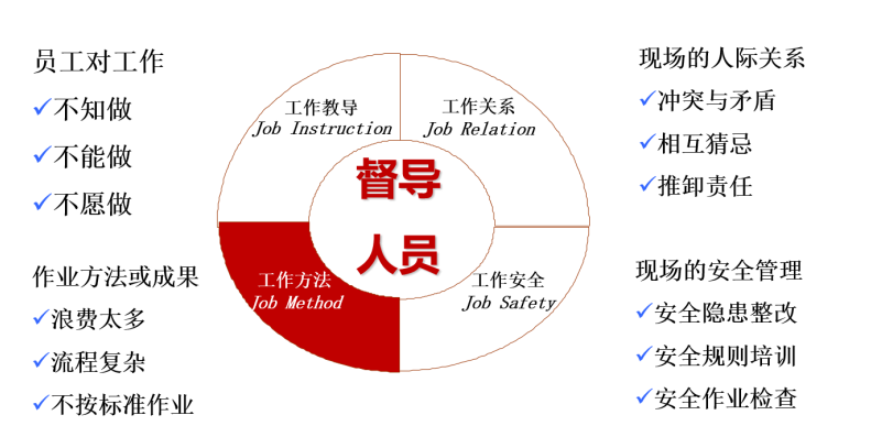 TWI共分为四个单元:JI(Job Instruction)工作教导、JM(Job Method)工作方法、JR (Job Relation)工作关系、JS(Job Safety)工作安全,TWI四个单元有机系统地联系在一起,是世界各国工厂训练班组管理人员最优秀的王牌培训课程。