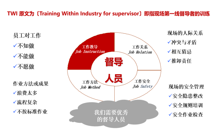 TWI(Training Within Industry For Supervisors)训练,是针对企业班组管理人员应具备的知识及技巧而拟定的一套系列训练课程。
