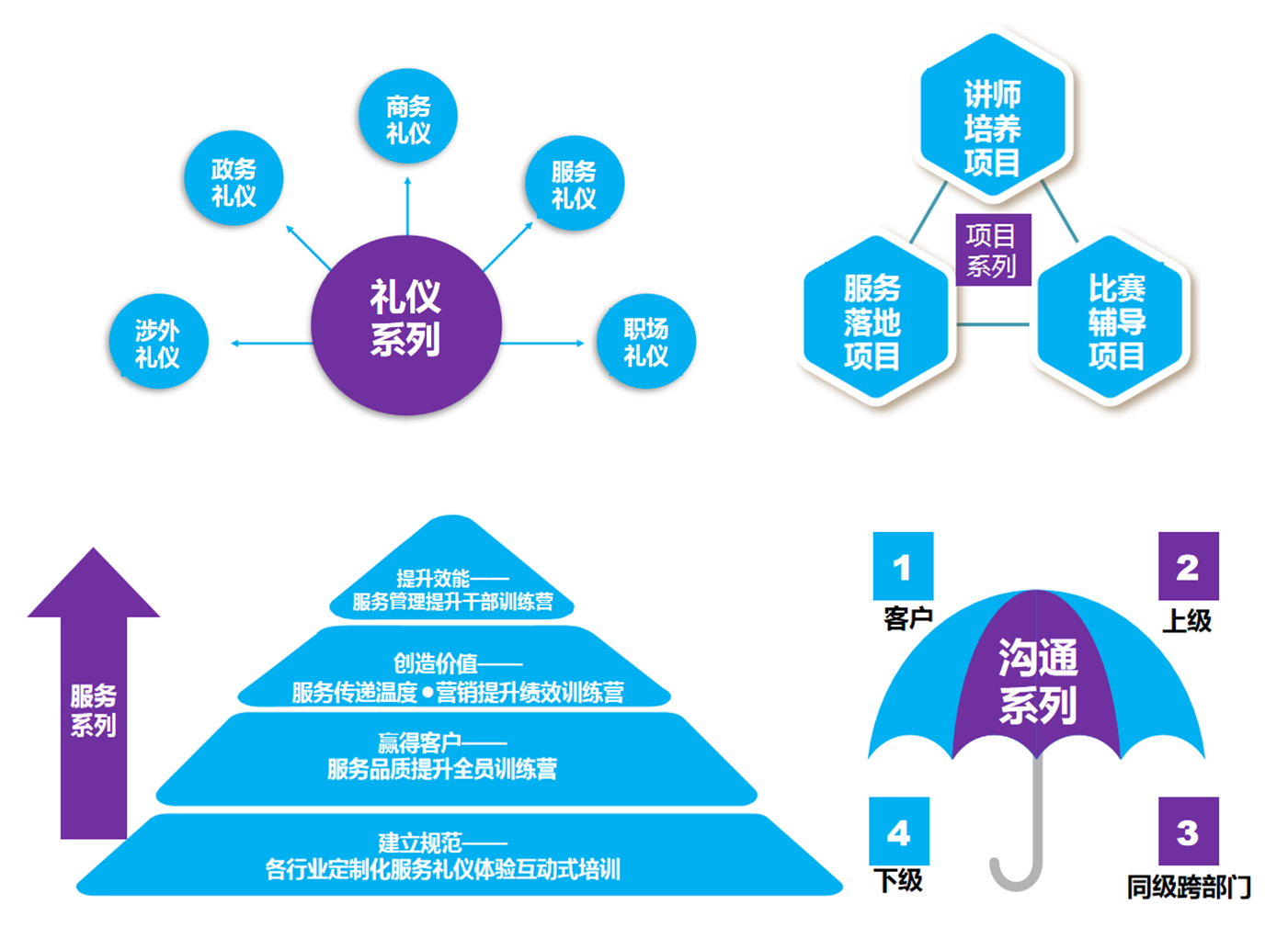 礼仪系列、服务系列、高效沟通、演讲口才、客户投诉处理、礼仪大赛、讲师大赛、服务品质提升训练营、TTT讲师训练营、管理干部领导力提升训练营